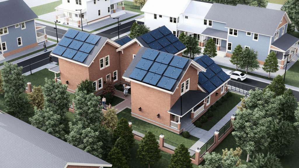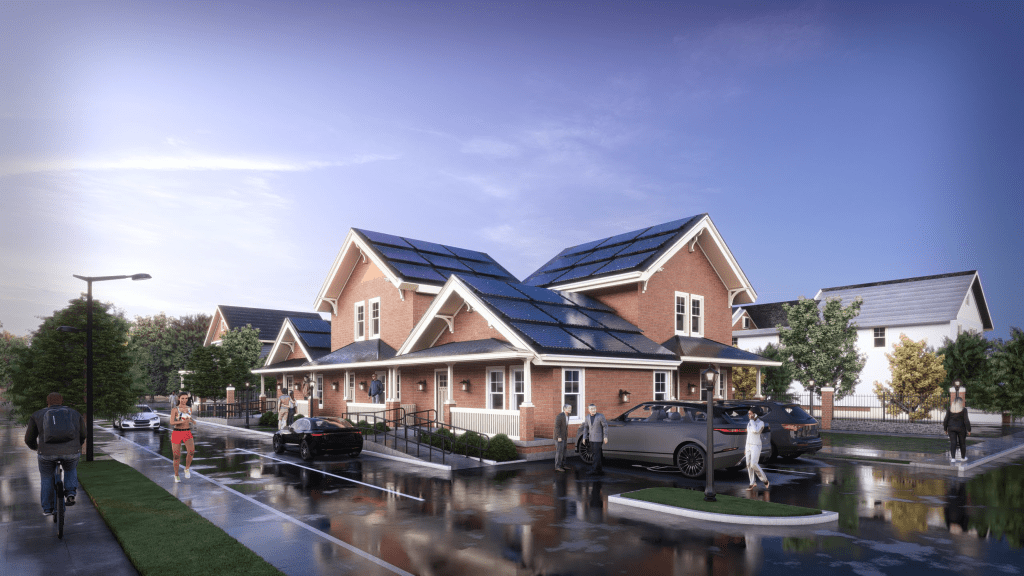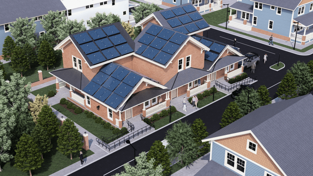 On corner lots with lane access, density is optimized by designing townhomes in a U-shape while maintaining private front entries for all 5 units, with a communal outdoor courtyard space accessible by 3 of the units through a back door.